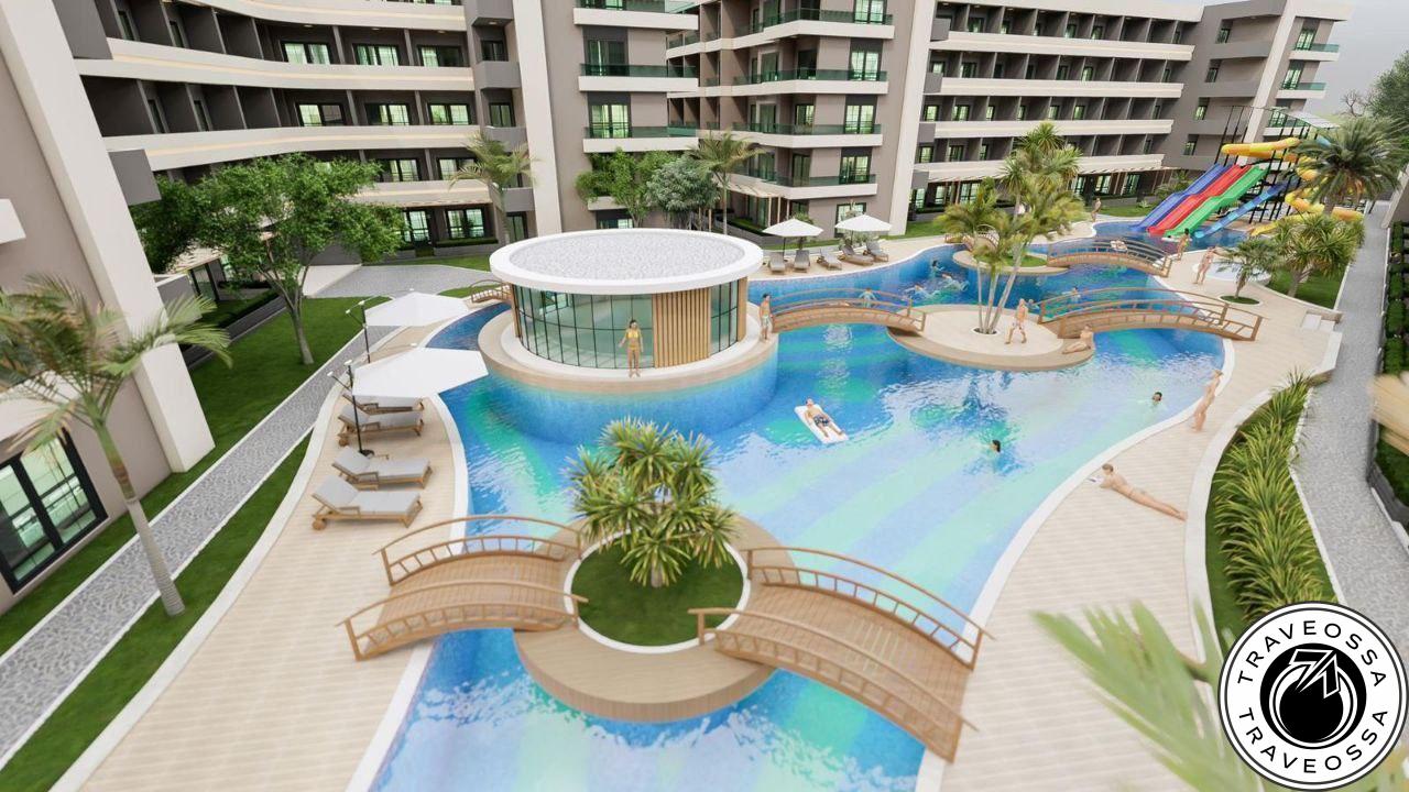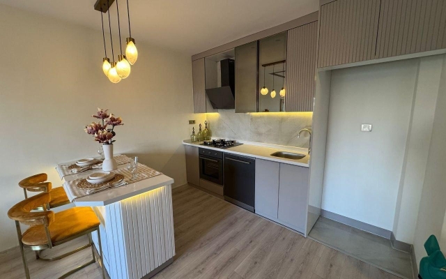 استمتع بأجواء المنتجع على بعد 350 م فقط من البحر في هذه الشقة-فيلا 1+1 الساحرة مع حديقة خاصة. التسليم المتوقع ديسمبر 2025.